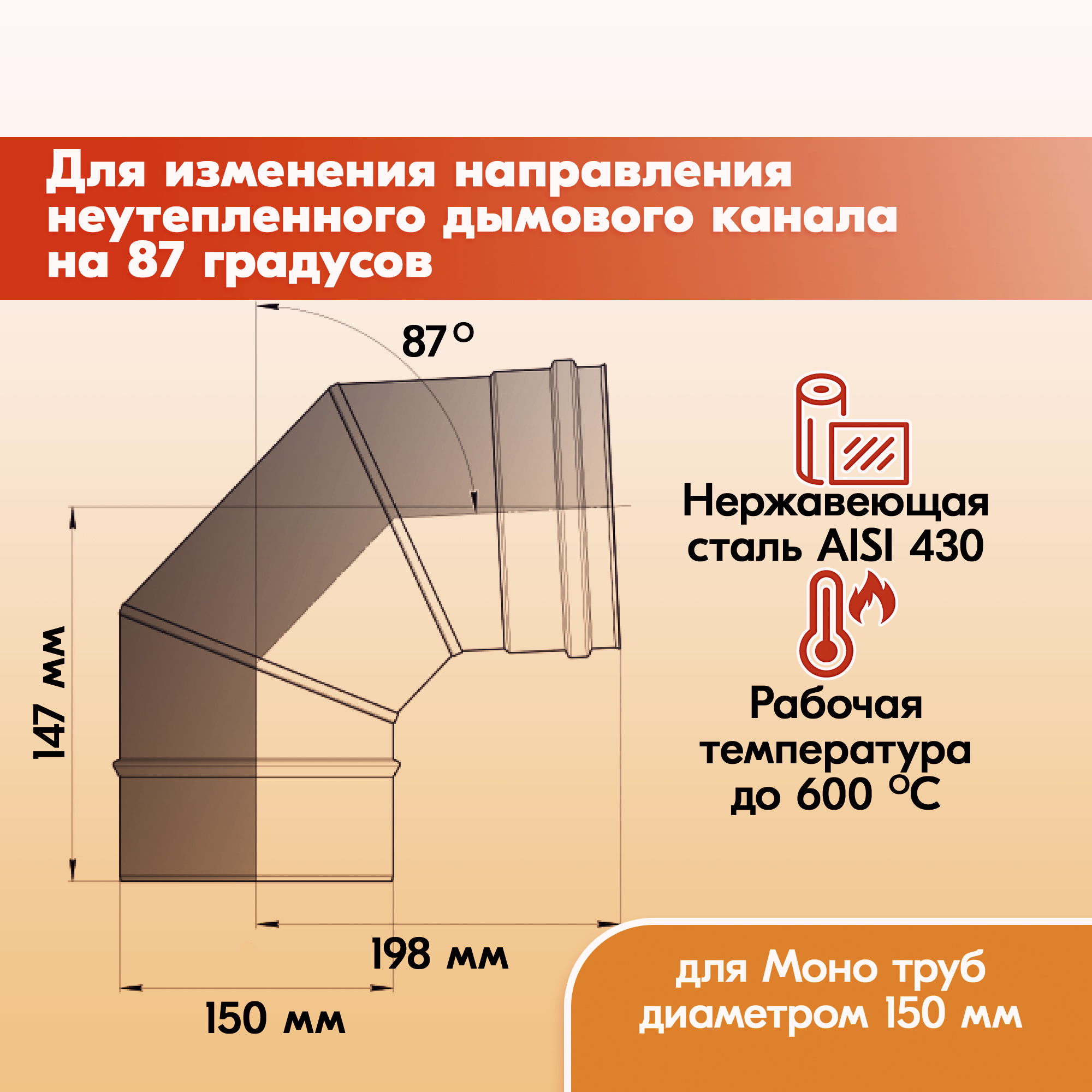 Одноконтурный отвод дымохода Моно подходит для установки на печное оборудование отапливаемое газом, дровами или пеллетами.