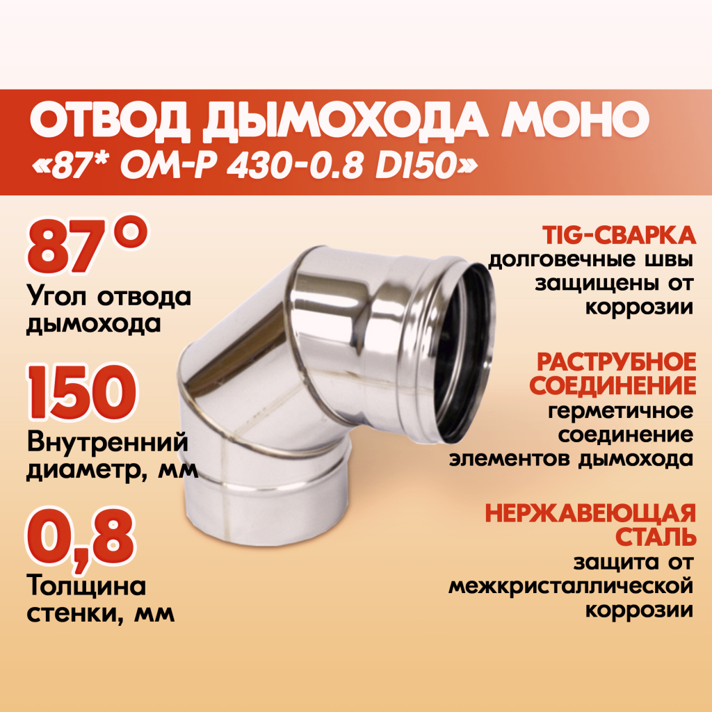 Отвод для дымохода Моно ОМ-Р от производственной компании Теплов и Сухов является элементом дымоходной системы и предназначен для изменения направления неутепленного дымового канала на 45 градусов или 87 градусов в зависимости от конфигурации.