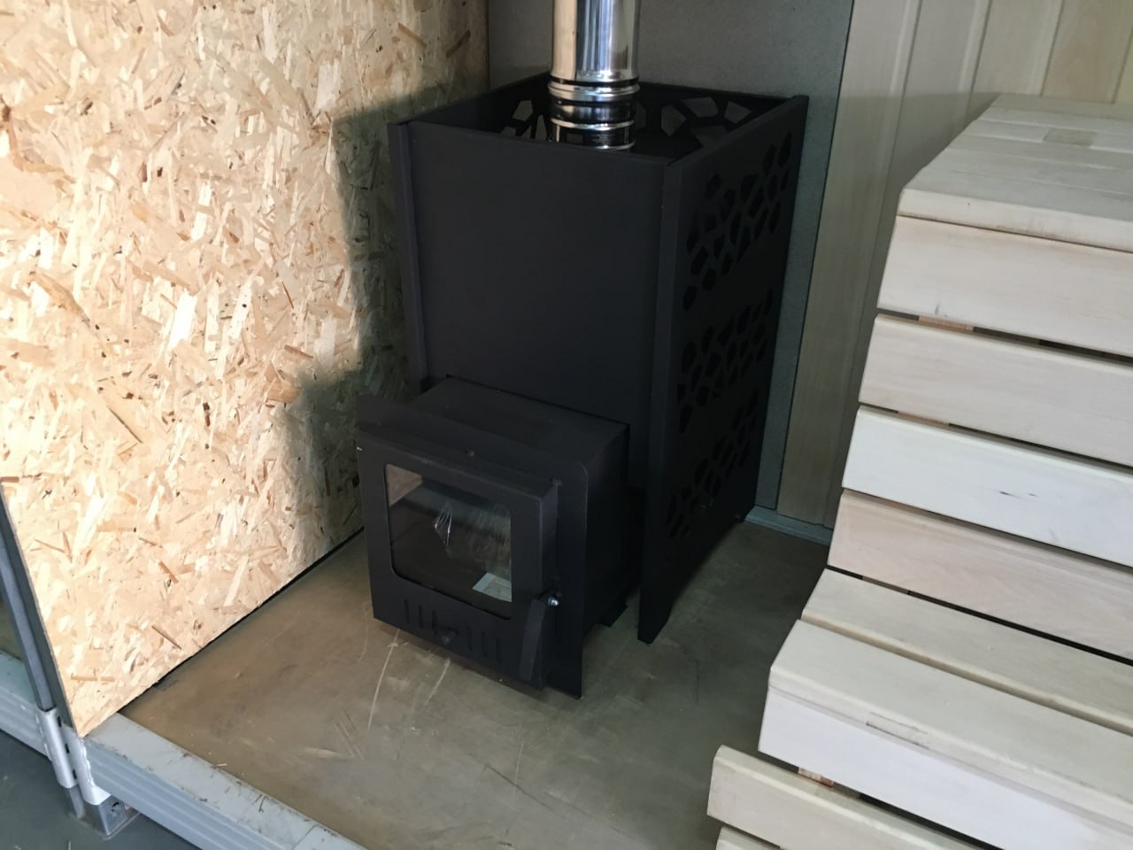 Разборная металлическая облицовка выполняет функцию конвекционного кожуха, создающего круговой конвекционный поток и способствующего быстрому нагреву парной.