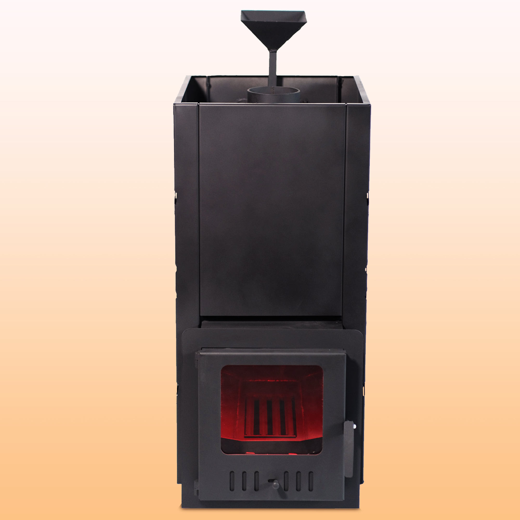 Форма дна и круглая массивная конструкция закрытой каменки, выполняющей роль отбойника пламени, завихряют поток пламени и дымовых газов, обеспечивая эффективный дожиг.