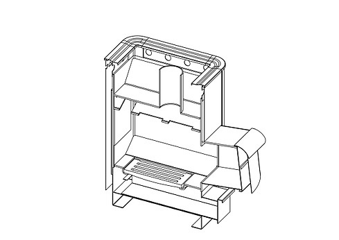 2. В конструкции печи реализована эффективная схема теплообмена, существенно ускоряющая нагревание воздуха в парильном и смежных помещениях за счет образуемого мощного кругового конвекционного потока.