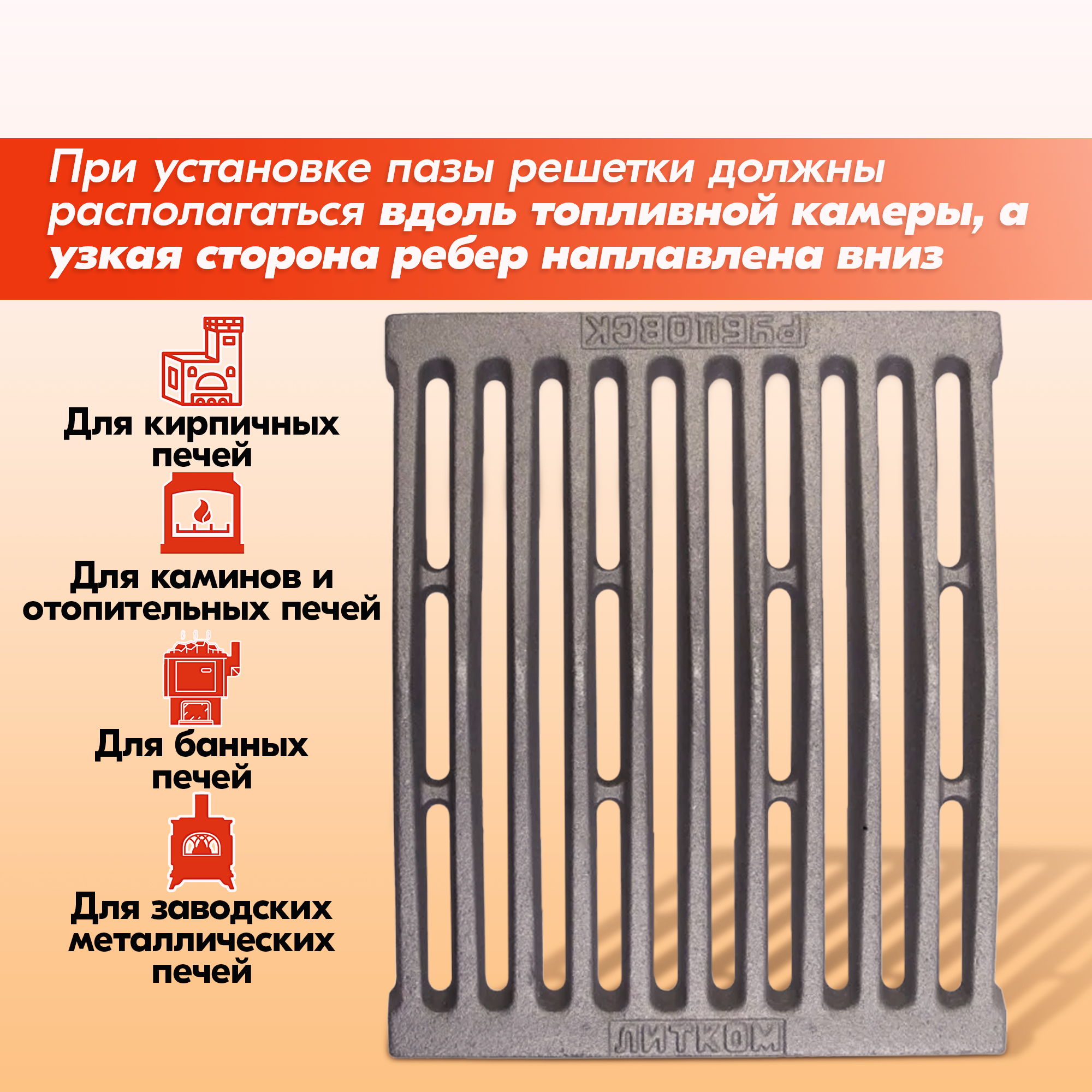 Располагать решетку колосниковую в топке обязательно узкой стороной ребер вниз, иначе срок её службы значительно снижается.