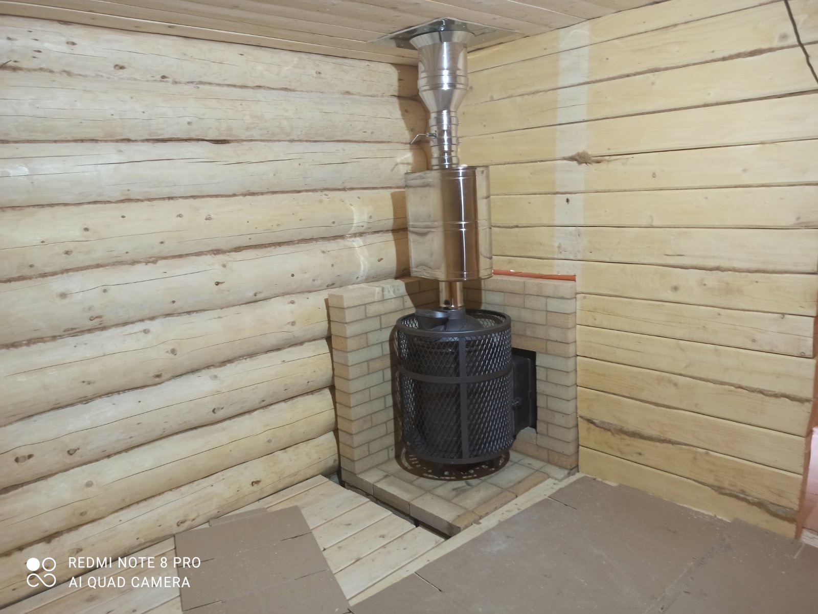 Монтаж банной печи Атмосфера с кирпичным порталом и дымоходом